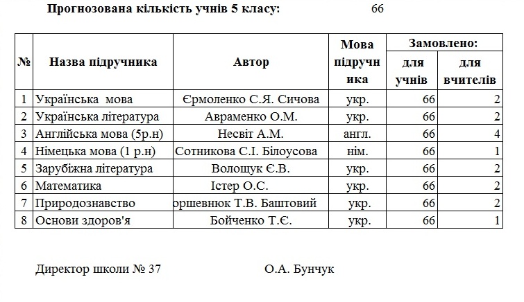 - Надати попереднє замовлення підручників для 5 класу на 2018-2019 навчальний рік за списком (додається).